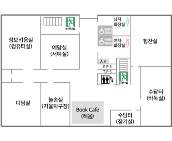 | 지상 2층 | 정보키움실(컴퓨터실) / 예담실(서예실) / 디딤실 / 늘솜실(자율탁구장) / 수담터(장기·바둑실) / 힘찬실 / book cafe;(혜움) |